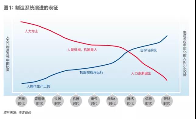 從制造系統(tǒng)演進(jìn)過程可發(fā)現(xiàn)兩個(gè)特征性的變化:一是從“人力為主”到“人是機(jī)器,機(jī)器是人”,再到“人力逐漸退出”;二是從“人操作生產(chǎn)工具”到“機(jī)器按程序運(yùn)行”,再到“自學(xué)習(xí)系統(tǒng)”。第一個(gè)變化反映了人力在制造系統(tǒng)中的比重逐漸降低;第二個(gè)變化反映了制造系統(tǒng)中固化的人的知識和經(jīng)驗(yàn)所占比重逐漸提高。圖1展示出了這種變化趨勢。由此可以預(yù)期制造系統(tǒng)演進(jìn)的方向,人們力求人力(強(qiáng)調(diào)是人力而不是人)從制造系統(tǒng)中退出,使系統(tǒng)學(xué)會(huì)像人一樣思考和工作,成為一個(gè)自學(xué)習(xí)系統(tǒng)。新一代信息技術(shù)、人工智能與制造業(yè)的融合發(fā)展,有力促進(jìn)了制造業(yè)逼近這個(gè)方向。