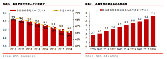 目前我國面臨著勞動力人口占比下降,勞動力成本上升的雙重壓力。制造業(yè)產(chǎn)業(yè)初期憑借勞 動力成本優(yōu)勢獲得的競爭優(yōu)勢已經(jīng)被逐漸削弱,制造業(yè)提質(zhì)增效成為下一階段的重要任務(wù)。