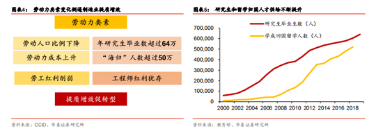 供給端,“人口紅利”稀釋,“工程師紅利”仍存。得益于高等教育的發(fā)展和長期對外開放, 國際交流的積累,我國研究生畢業(yè)人數(shù)逐年攀升,2019 年超過 64 萬人,海外學(xué)成歸國人 數(shù)增長迅猛,2018 年達到 50 萬人。高素質(zhì)人才供給充裕,為我國制造業(yè)提質(zhì)增效轉(zhuǎn)型升 級提供了基礎(chǔ)。