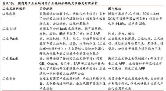 從工業(yè)互聯(lián)網(wǎng)的不同層級(jí)分析,我國(guó)仍與國(guó)外有一定差距。其中在邊緣采集層面,我國(guó)缺 乏工控領(lǐng)域的領(lǐng)軍企業(yè),95%中高端 PLC 市場(chǎng)、 50%以上的 DCS 市場(chǎng)被跨國(guó)公司壟斷;國(guó)產(chǎn)化的工控自動(dòng)化核心部件產(chǎn)品僅占 35%的市場(chǎng)份額。在工業(yè) PaaS 層上,整合控制系 統(tǒng)、通信協(xié)議、生產(chǎn)裝備、管理工具、專業(yè)軟件等各類(lèi)資源的能力不足;集業(yè)務(wù)流程咨詢、 軟件部署實(shí)施、平臺(tái)二次開(kāi)發(fā)、系統(tǒng)運(yùn)行維護(hù)等于一體的綜合能力欠缺。在工業(yè) SaaS 層 上,高端工業(yè)軟件主要依賴進(jìn)口;缺乏相關(guān)開(kāi)發(fā)者社區(qū)。