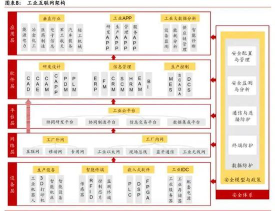 從產(chǎn)業(yè)鏈作用來(lái)看,工業(yè)設(shè)備是基礎(chǔ),工業(yè)網(wǎng)絡(luò)是媒介,工業(yè)云平臺(tái)是核心,工業(yè)軟件是 承上啟下數(shù)據(jù)利用的關(guān)鍵,工業(yè)互聯(lián)網(wǎng)應(yīng)用是價(jià)值兌現(xiàn)的載體,工業(yè)安全是體系保障。