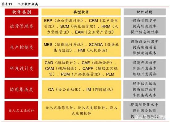 傳統(tǒng)制造時(shí)代,工業(yè)軟件是提升效率的工具。工業(yè)軟件指專用于或主要用于工業(yè)領(lǐng)域,以 提高工業(yè)企業(yè)研發(fā)、制造、管理水平和工業(yè)裝備性能的軟件,包括運(yùn)營(yíng)管理類(lèi)、生產(chǎn)控制 類(lèi)、研發(fā)設(shè)計(jì)類(lèi)、協(xié)同集成類(lèi)和嵌入式工業(yè)軟件等。