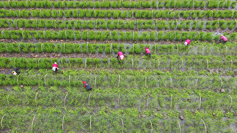 2023年2月23日,浙江省溫嶺市新河鎮(zhèn)農(nóng)民進(jìn)行茭白秧苗春季管理(無人機(jī)照片)。新華社發(fā)(周學(xué)軍 攝)