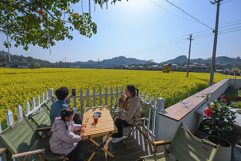 2023年3月28日,在杭州市臨安區(qū)太陽鎮(zhèn)太陽米基地旁的一家民宿餐廳,客人在院子里喝茶賞景。新華社記者 徐昱 攝