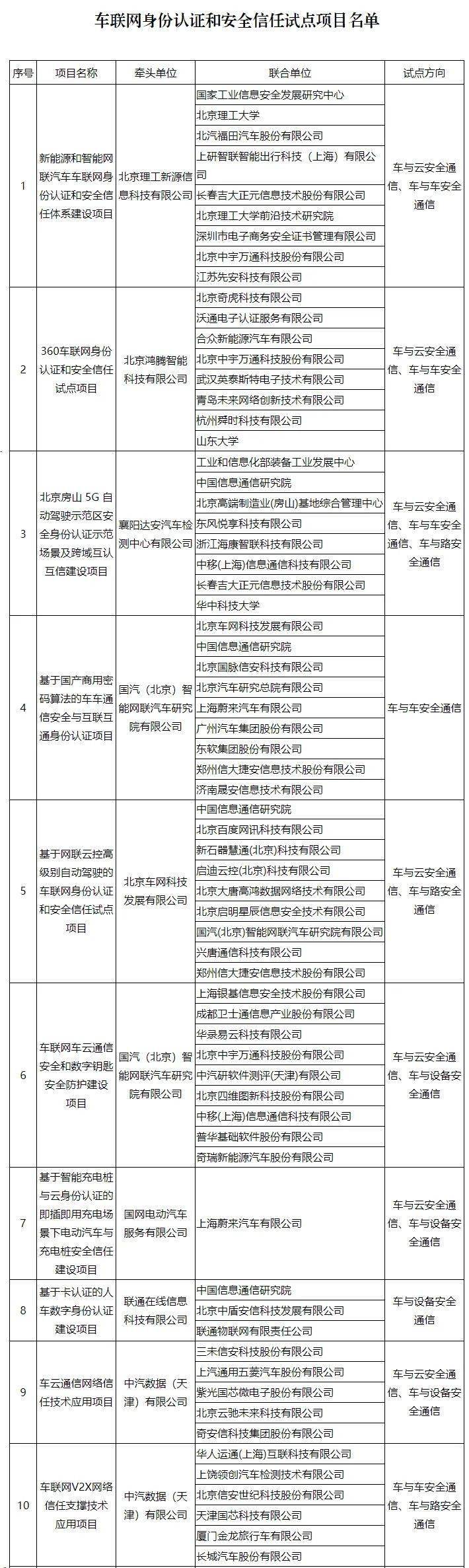 附件:車聯網身份認證和安全信任試點項目名單