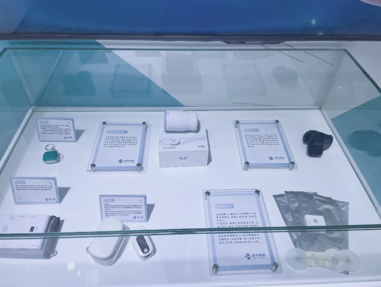 在移動診療車隔壁的展柜里,展現(xiàn)著幾種可穿戴設(shè)備。包括智能定位儀、動態(tài)血糖監(jiān)測儀、智能一體機,智能心貼、智能手表等。其中,智能心貼可以監(jiān)測心電、血氧、呼吸、體溫,可以實現(xiàn)基于數(shù)據(jù)的實時遠程初篩及具有基于人工智能云系統(tǒng)的預(yù)警能力,實現(xiàn)健康監(jiān)測、診斷報告、就醫(yī)提醒、實時定位等,告知患者防患于未然。