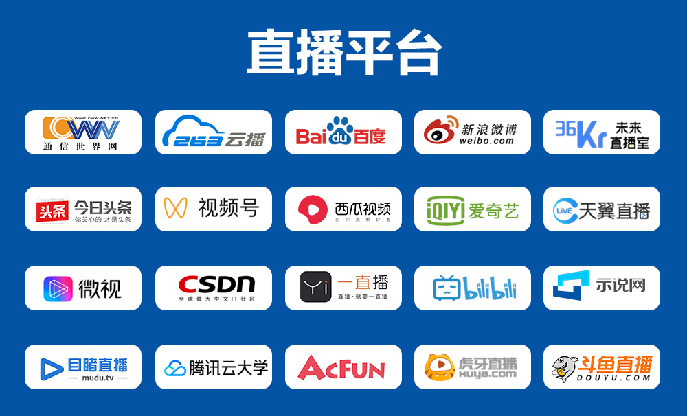 直播渠道包括但不限于:央視頻移動(dòng)網(wǎng)、百度、36Kr、新浪微博、今日頭條、CSDN、西瓜視頻、愛奇藝、微信視頻號(hào)、微視、抖音、快手、B站、A站、騰訊云大學(xué)、一直播、示說網(wǎng)、虎牙直播、斗魚直播、目睹直播、企鵝直播、YY直播等。
