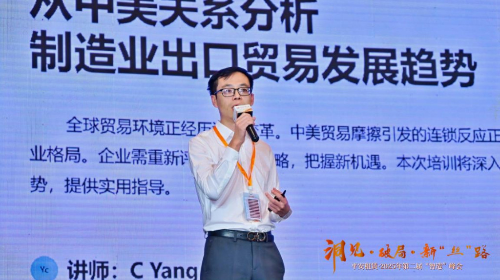 在《從中美關系分析制造業出口貿易發展趨勢》主題分享環節,越南茂碩電子有限公司總經理楊超從中美關系下全球貿易格局、中國制造業轉型挑戰、國際化破局策略及海外管理實務四個維度,系統闡述了全球變局下中國制造業出口的突圍路徑,強調主動國際化與科學布局是應對關鍵。