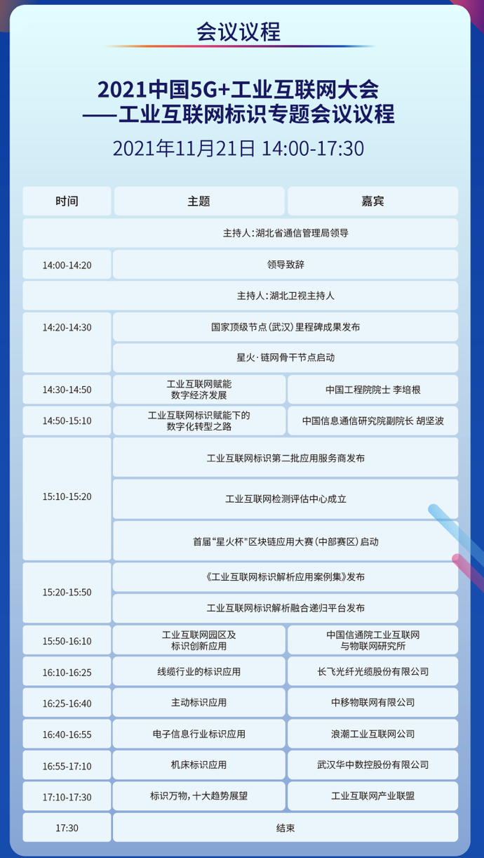 工聯(lián)網(wǎng)消息(IItime) 為貫徹落實(shí)習(xí)近平總書(shū)記致首屆中國(guó)5G+工業(yè)互聯(lián)網(wǎng)大會(huì)賀信精神,搶抓數(shù)字經(jīng)濟(jì)發(fā)展新機(jī)遇,深入推進(jìn)5G與工業(yè)互聯(lián)網(wǎng)融合發(fā)展,2021年11月19日至21日,由工業(yè)和信息化部、湖北省人民政府主辦,工業(yè)和信息化部新聞宣傳中心、中國(guó)信息通信研究院等單位承辦的2021中國(guó)5G+工業(yè)互聯(lián)網(wǎng)大會(huì)將在湖北省武漢市召開(kāi)。 2021中國(guó)5G+工業(yè)互聯(lián)網(wǎng)大會(huì)“工業(yè)互聯(lián)網(wǎng)標(biāo)識(shí)”專(zhuān)題會(huì)議暨中國(guó)工業(yè)互聯(lián)網(wǎng)標(biāo)識(shí)大會(huì)(武漢)將于11月21日下午召開(kāi)。