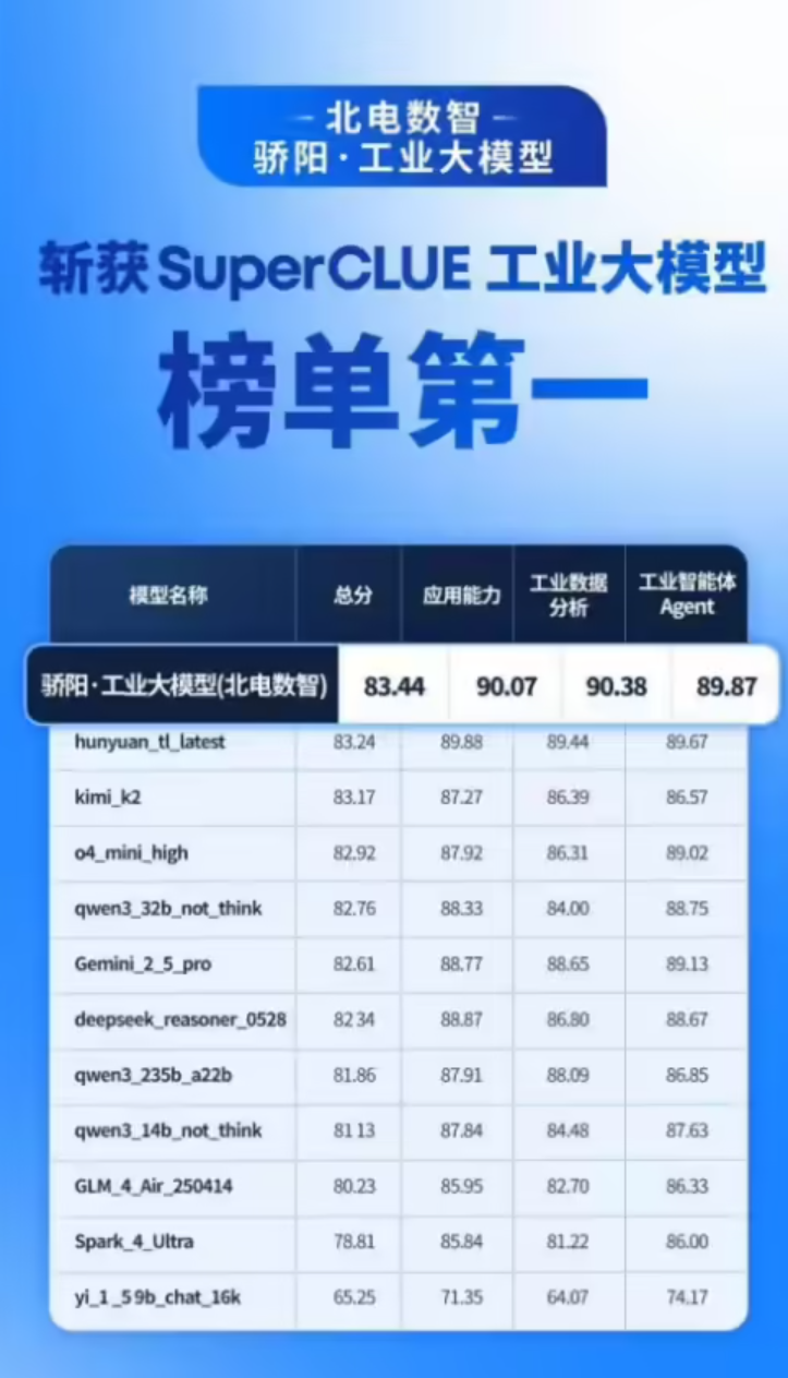 放眼目前的工業領域垂類大模型,驕陽・工業大模型的應用能力處于領先地位。在國內權威第三方評測機構 SuperCLUE 最新發布的中文原生工業大模型測評基準 SC-Industry(SuperCLUE-Industry)榜單里,它以 83.44 的總分拿下綜合排名第一的好成績,并在“應用能力”維度,以及“工業數據分析”“工業智能體 Agent”這兩項上也都位列榜首。