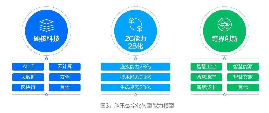 如探究創新的本質,其并非是從0-1的創新,而是組合式創新,是現有要素的全新組合。尤其是在后工業時代,越是看似不相關的要素組合在一起,越是會帶來意想不到的驚喜。騰訊的邏輯便是將集團的技術與生態資源以最優的方式組合在一起,并以云作為統一出口,服務好各行各業的數字化轉型。 硬核數字技術、2C能力2B化與跨界創新實踐構成了騰訊服務產業數字化的基礎能力模型。