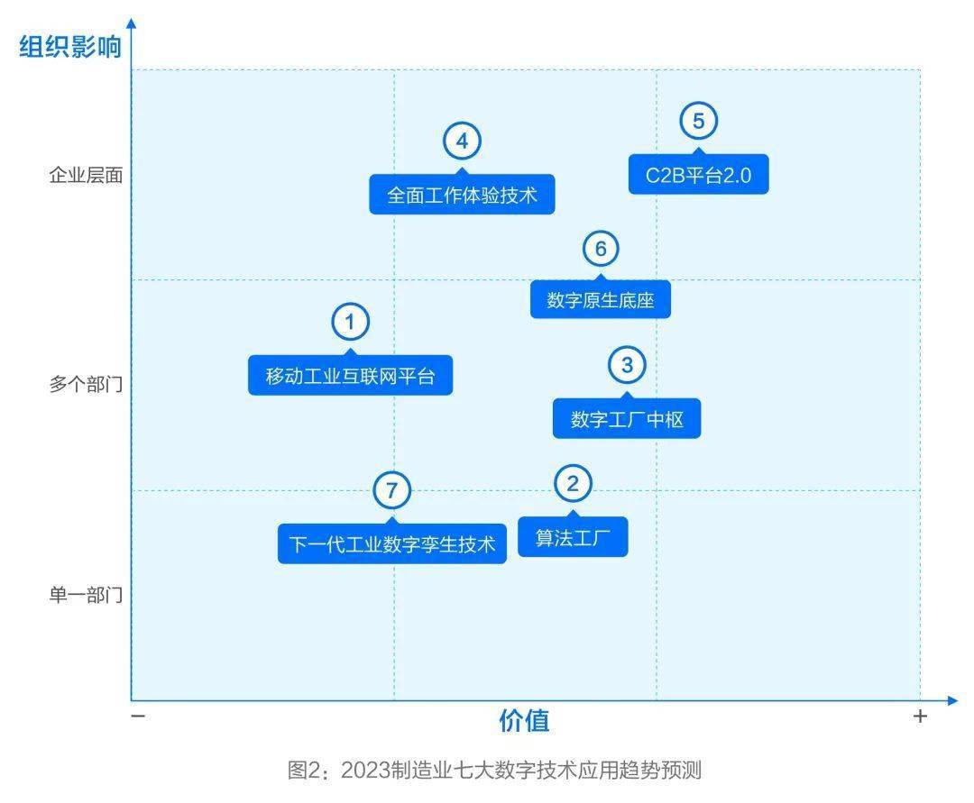 數字化創新的成功絕非僅憑單一或是少數技術的應用,而是依托技術之間不同組合所釋放的乘法效應。伴隨數字化的精耕細作OT、DT、IT技術之間的融合也在提速,且不斷擴大其影響。根據騰訊的觀察,2023年七項數字技術有望擴大其在組織內部的應用范圍,并創造明顯的價值與收益。
