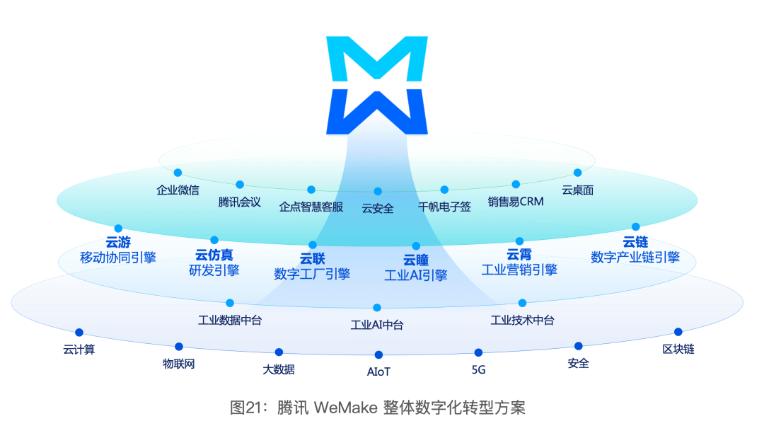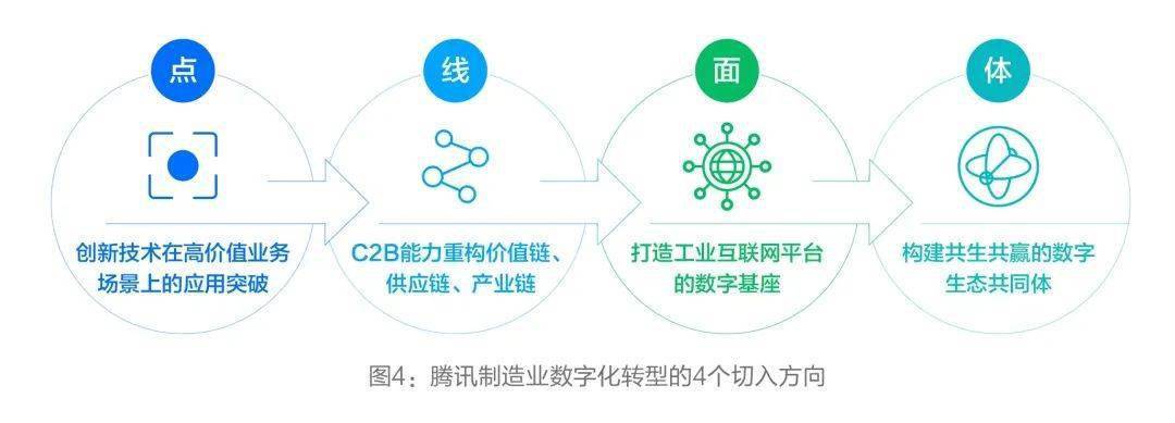 騰訊智能制造分別就點、線、面、體四個維度,不斷摸索自 身的的定位、差異化優勢、以及發展路徑,將騰訊的硬核科技、2C能力優勢以及跨界創新領域的最佳實踐成功轉化為制造業專屬的產品、 服務與解決方案。