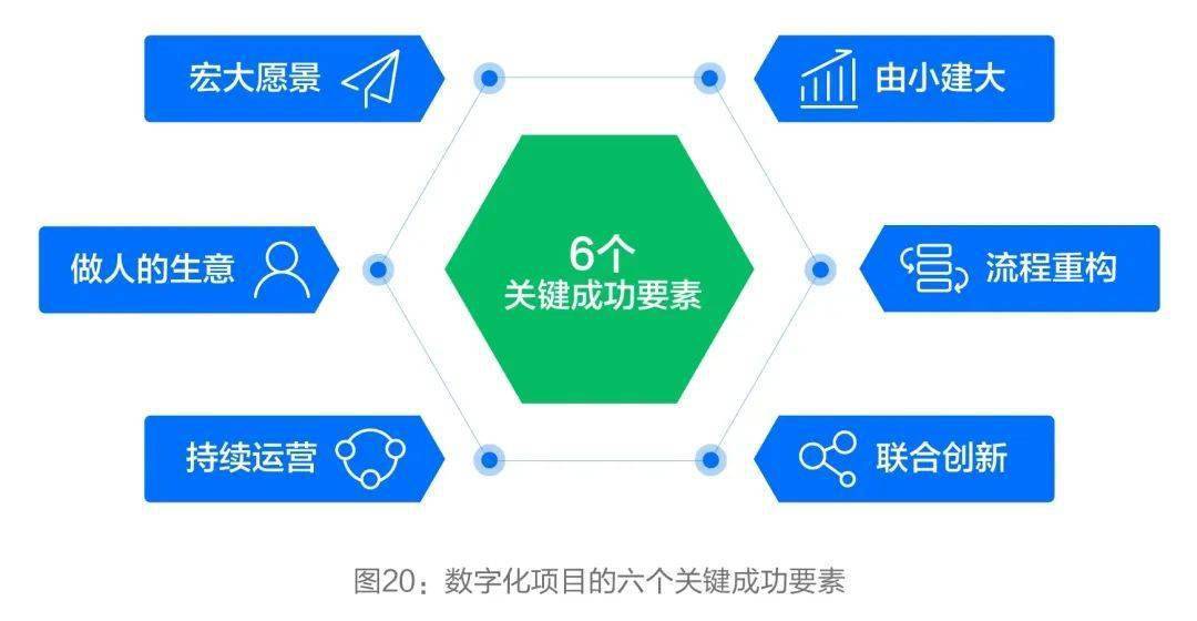 在騰訊參與的眾多轉型實踐過程中我們發現,無論數字化轉型處于什么階段、采用什么樣的技術與路徑,其基本的成功要素都是相似的。凡具備以下六個關鍵要素的數字化項目,成功的可能性會成倍增加: