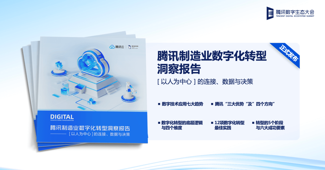 11月30日,2022騰訊全球數字生態大智能制造論壇正式舉辦。會上,騰訊云聯合騰訊研究院發布《騰訊制造業數字化轉型洞察報告》,全面展示騰訊在服務制造業數字化轉型領域的思考、定位、優勢能力,以及在研、產、供、銷、服領域的案例與最佳實踐。