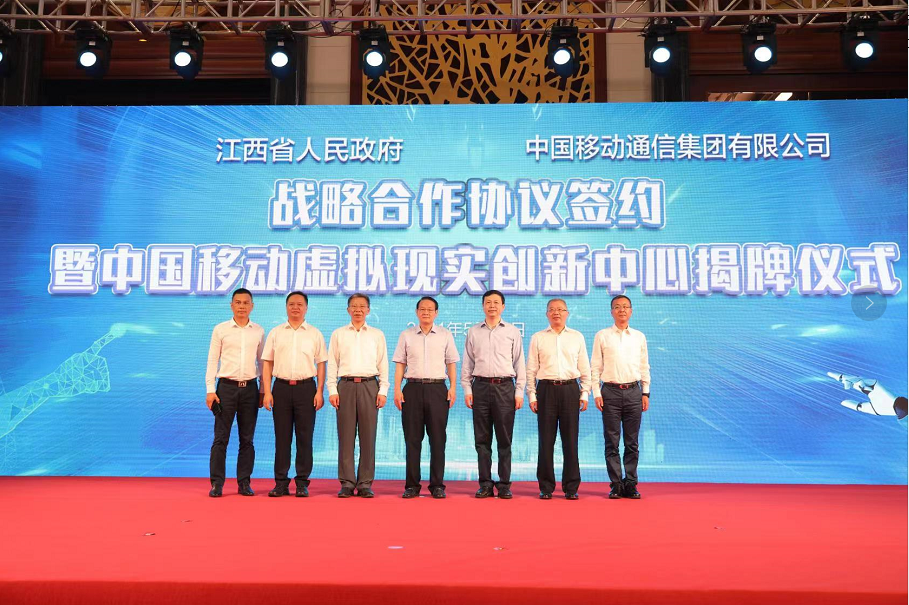 江西省省長(zhǎng)易煉紅和中國(guó)移動(dòng)董事長(zhǎng)楊杰共同為中國(guó)移動(dòng)虛擬現(xiàn)實(shí)創(chuàng)新中心揭牌,江西省副省長(zhǎng)羅小云和中國(guó)移動(dòng)副總經(jīng)理簡(jiǎn)勤共同簽署戰(zhàn)略合作協(xié)議。