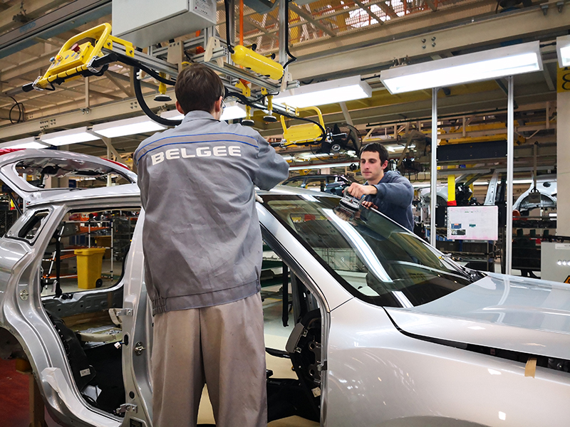 這是2018年12月1日在白俄羅斯首都明斯克東北方向50公里處的白俄羅斯吉利全散件汽車制造廠總裝車間拍攝的工人組裝車體。