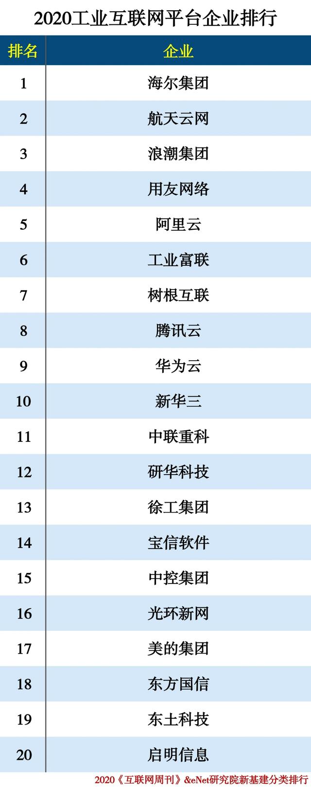 4月7日,中國科學(xué)院《互聯(lián)網(wǎng)周刊》聯(lián)合eNet研究院發(fā)布2020新基建分類排行榜,分別對5G基站建設(shè)、特高壓、工業(yè)互聯(lián)網(wǎng)等7大領(lǐng)域的基礎(chǔ)設(shè)施建設(shè)進(jìn)行了排行。其中在工業(yè)互聯(lián)網(wǎng)領(lǐng)域,20家平臺企業(yè)上榜,海爾卡奧斯、航天云網(wǎng)、浪潮集團(tuán)分列第一、二、三名。