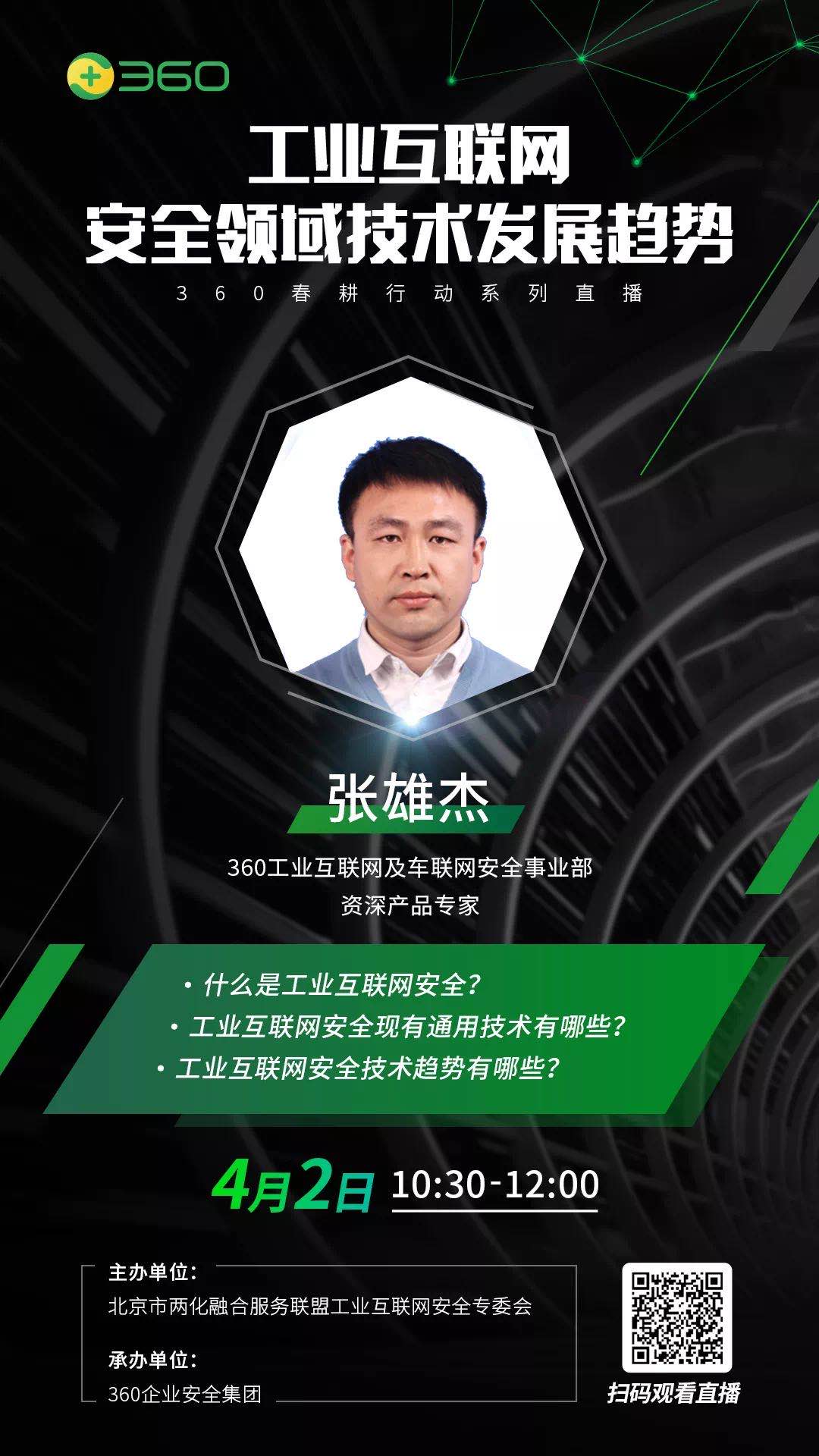 工聯(lián)網(wǎng)消息(IItime) 4月2日,360春耕行動(dòng)系列直播第六期由北京市兩化融合服務(wù)聯(lián)盟工業(yè)互聯(lián)網(wǎng)安全專委會(huì)主辦,360企業(yè)安全集團(tuán)承辦。活動(dòng)圍繞“工業(yè)互聯(lián)網(wǎng)安全領(lǐng)域技術(shù)發(fā)展趨勢(shì)”展開(kāi),由360資深產(chǎn)品專家張雄杰擔(dān)任分享嘉賓,繼三期“新基建”主題研討后,針對(duì)其重要一環(huán)——工業(yè)互聯(lián)網(wǎng),進(jìn)行了深度解讀。