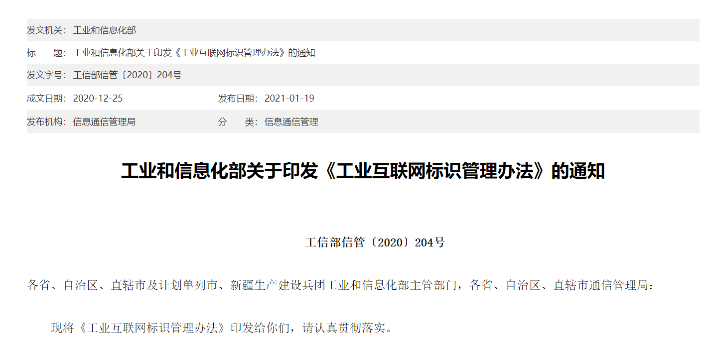 工聯(lián)網(wǎng)消息(IItime)1月19日,工信部發(fā)布《工業(yè)互聯(lián)網(wǎng)標識管理辦法》(以下簡稱《管理辦法》),并將于2021年06月01日起施行。