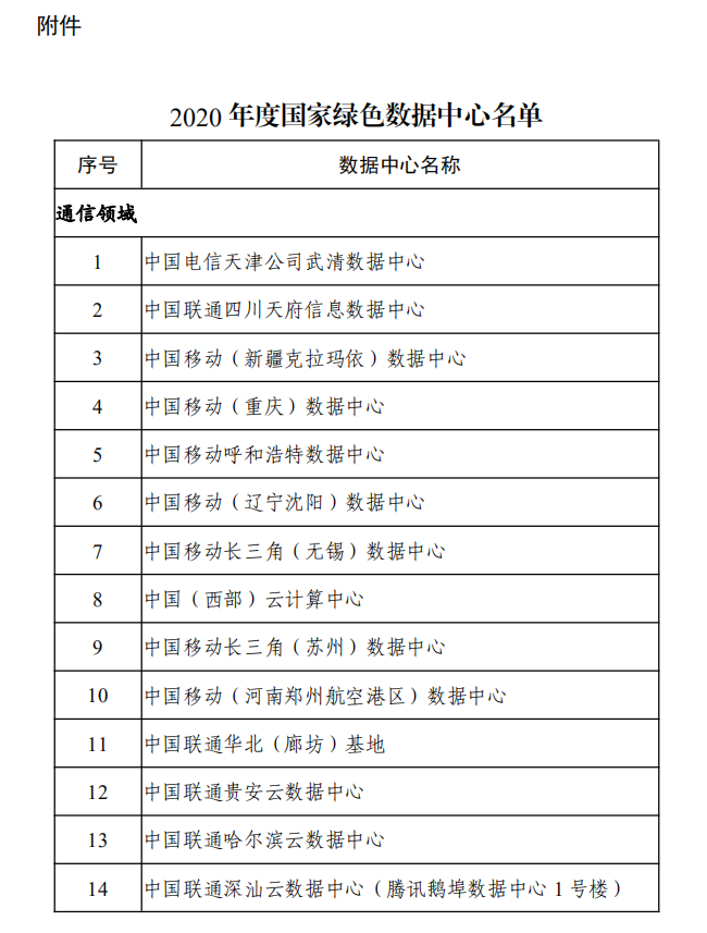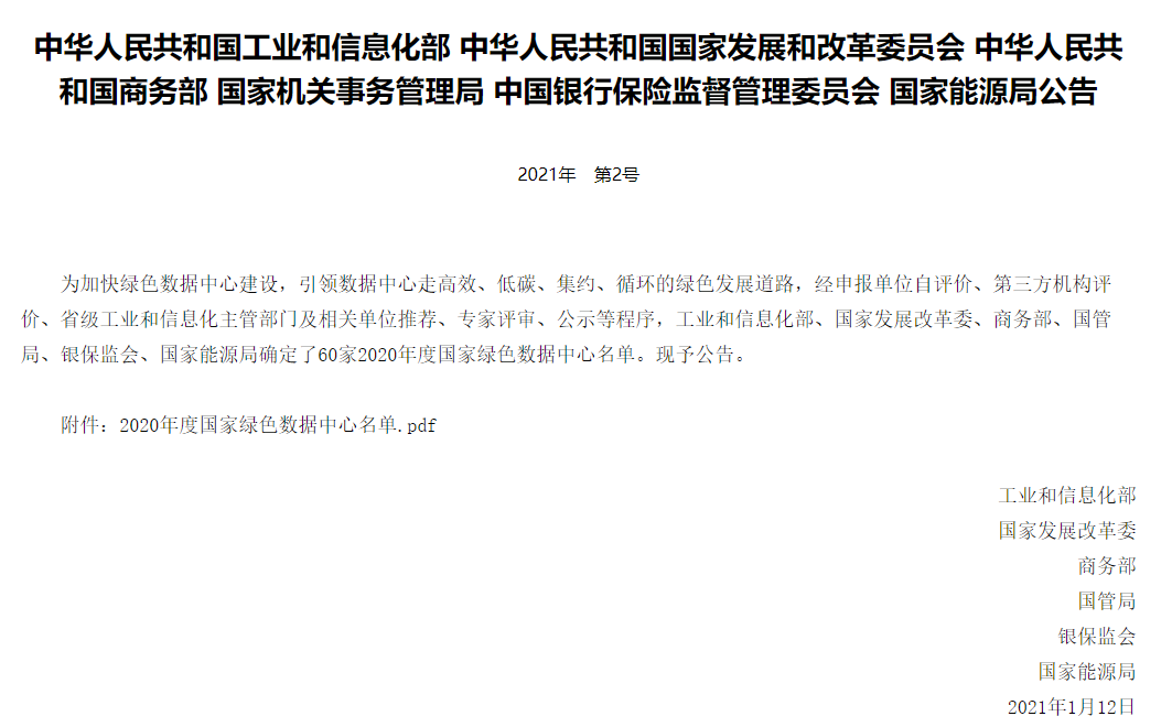 工聯網消息(IItime)1月28日,工聯網記者從工信部官網獲悉,為加快綠色數據中心建設,引領數據中心走高效、低碳、集約、循環的綠色發展道路,經申報單位自評價、第三方機構評價、省級工業和信息化主管部門及相關單位推薦、專家評審、公示等程序,工業和信息化部、國家發展改革委、商務部、國管局、銀保監會、國家能源局確定了60家2020年度國家綠色數據中心名單。